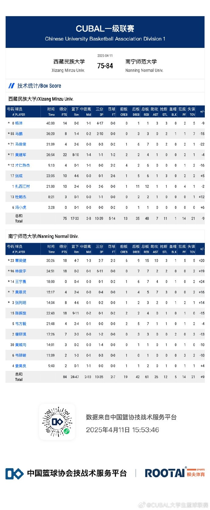 🏀CUBAL-覃梁建18+15+10 4人夺权罚下 南宁师大轻取西藏民大