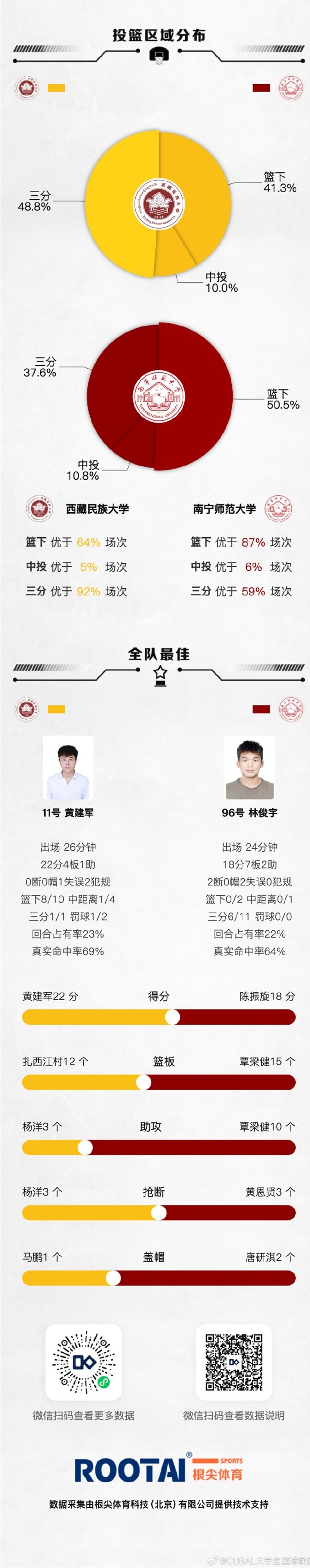 西藏民族大学:黄建军22分4篮板、扎西江村10分12篮板、杨洋14分3助攻3抢断、张成10分6篮板3抢断、马鹏8分3篮板2抢断、马俊俊4分7篮板2抢断、才仁热杰4分6篮板、杜朝杰3分2篮板。