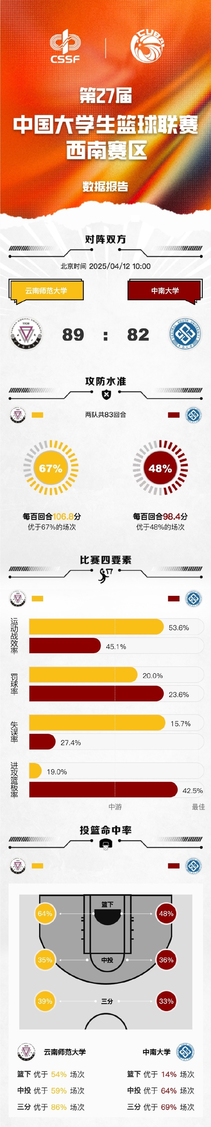 末节云南师大找回状态,李邱宇开局不久命中三分,皮昌盛则在随后连续轰进三分,云南师大开局送上17-5的攻势一举反超比分。末段中南大学一直紧咬比分但屡屡错失反超机会球,陈昱豪制造三分犯规三罚两中为云南师大稳住局面,末段他和皮昌盛连续打成关键球将优势拉大至7分锁定胜局。最终,云南师范大学89-82力克中南大学拿下比赛。