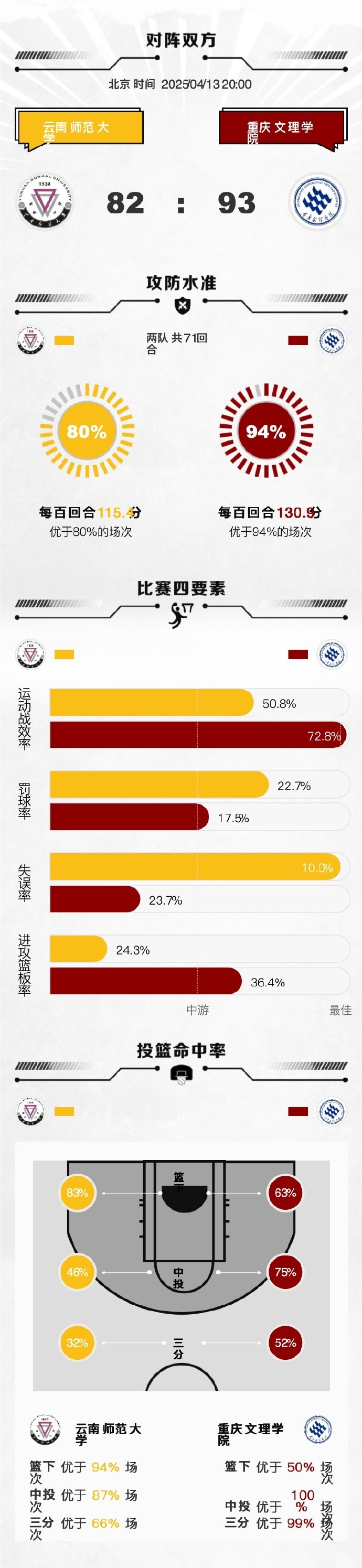 末节之争王睿的三分帮助重庆文理再次拉开两位数分差,但云南师大也在随后依靠皮昌盛的三分和三次罚球迅速追上比分。随后拉锯云南师大又出现间歇性的哑火,重庆文理这边给王睿和曾宇势不可挡连续拿分送出9-0的攻势拉开两位数分差奠定胜局。最终,重庆文理学院93-82击败云南师范大学杀入八强赛。