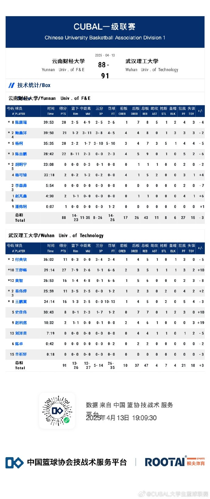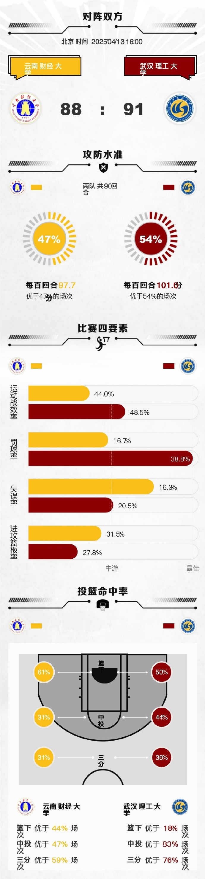 末节陈吉鹏和陈康瑞接连拿分抢开局,云南财大送上一波9-2的攻势追至3分重新看到希望;不过武汉理工及时回暖,黄智的2+1和付典钦的三分再度拉开比分。随后武汉理工顶住压力一直维持着5分左右的领先,王鹏翼和黄智最后时刻打进两记关键球拉开7分领先奠定胜局,陈康瑞最后的三分进球为时已晚。最终,武汉理工大学91-88力克云南财经大学顺利晋级8强。