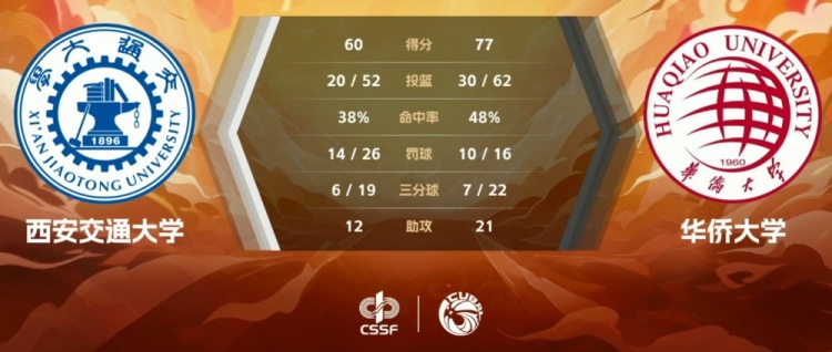 末节西安交大依旧找不到感觉,他们又是5分钟里仅依靠罚球拿到1分,华侨大学则又是张高铭的三分打出11-1的攻势将分差扩大至20分以上。陈帅君的抛投为西安交大破荒但已无济于事。最终,华侨大学77-60击败西安大学拿到今年第一张八强门票。