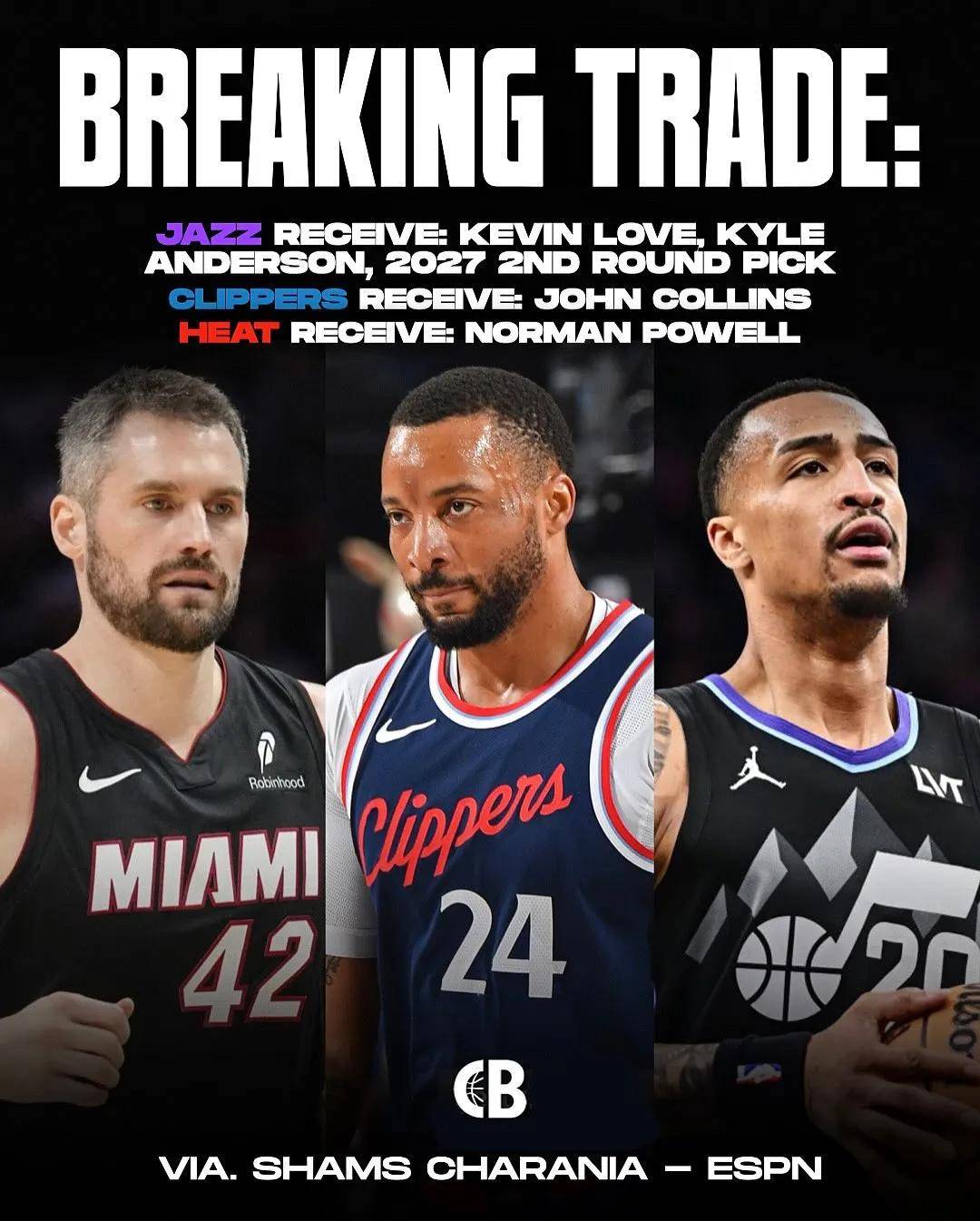 今年休赛期,热火、快船和爵士达成三方交易:约翰-科林斯加盟快船、诺曼-鲍威尔加盟热火。爵士得到凯文-乐福、李凯尔和1个快船的次轮签。ESPN交易评级,快船B、热火A、爵士A-。交易达成的第一时间,就传出乐福要被买断的消息。