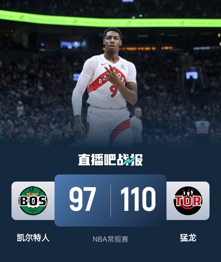 比赛开始,猛龙率先发力,接连外线发炮打出15-5梦幻开局,波津接连三分砍下8分强势带队咬住比分,随后凯尔特人替补继续发力首节反超4分,次节绿军进攻端陷入停滞,猛龙打出12-5攻击波反超比分,双探花都不准,普理查德三分接连止血,半场猛龙领先2分。下半场,塔图姆上来三分命中,绿军一度反超比分,但猛龙首发五虎谁打谁进强势回应,猛龙还是保持住两球以上领先,三节猛龙领先6分,末节猛龙上来一波9-2拉开双位数领先,波津劈扣止血,但双探花始终没手感,猛龙总能保持住双位数领先,最终猛龙110-97力克凯尔特人。
