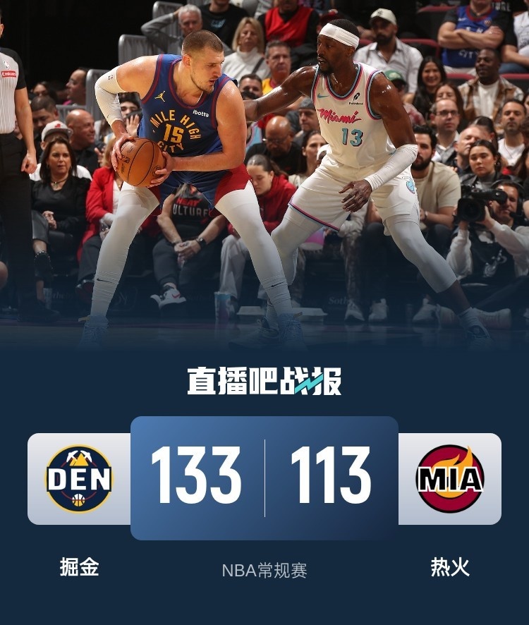 开场后穆雷手感不错接连拿分,掘金多点开花建立起11分优势。约维奇替补登场后连续拿分为热火追分,但威少手感不错外线多次三分命中,戈登也利用体型优势在篮下拿分,热火多次掀起反扑缩小分差,但掘金总能及时回应。易边再战,掘金依旧抢占先机上来连得6分,此后巴特勒和阿德巴约联手追分,但约基奇也强势回应帮助掘金始终保持两位数优势。最后一节掘金轮番强攻内线将分差拉大到20分,热火无力追分,最终掘金133-113送热火3连败,掘金对热火也是取得10连胜。
