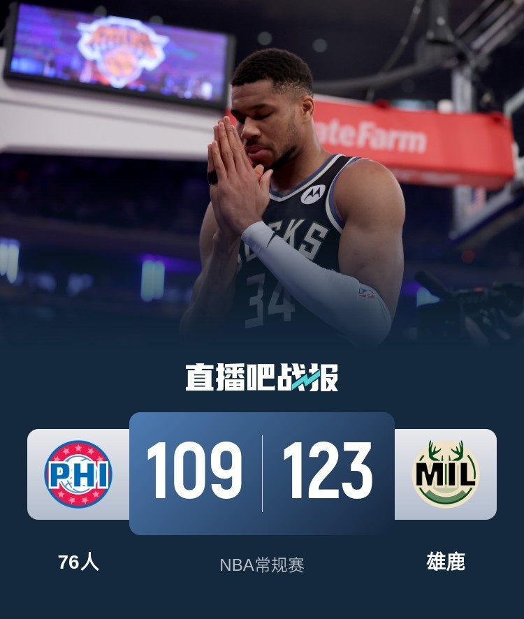 🏀字母哥34+15+6 利拉德25+5 马克西37+6+7 雄鹿送76人6连败