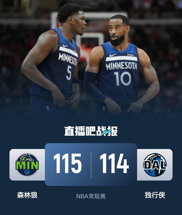 比赛开始,双方开场便陷入缠斗,比分咬得很紧,独行侠持续发力打出9-0的攻击波,次节两队展开对攻,森林狼多点开花反超比分,独行侠不断冲击内线频频得手顽强咬住,半场战罢森林狼55-53领先独行侠。易边再战,两队继续缠斗,比分交替领先,末节森林狼13-5取得两位数优势,欧文得分助攻一肩挑带队追赶,森林狼多点开花占据主动,独行侠内外开花迫近到只剩1分,关键时刻康利两罚全中,欧文绝平三分失手,最终,森林狼115-114险胜独行侠,客场过关。