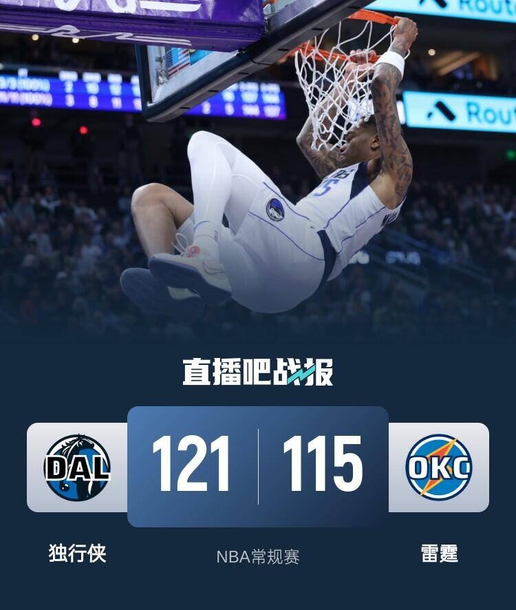 开场后杰伦-威廉姆斯表现抢眼帮助球队取得领先,独行侠多点开花追上比分,并且在丁威迪和华盛顿的发挥下一度反超比分,场上局面陷入僵持,卡鲁索三分命中帮助雷霆领先1分结束第一节。第二节回来雷霆外线多点开花扩大优势,普罗斯珀异军突起接连砍分帮独行侠缩小分差。易边再战,华盛顿成为球队进攻发起点帮助独行侠再度反超比分,多特打到加福德裆部被吹二级恶意犯规被驱逐,独行侠趁着这波机会将领先拉大到13分。最后一节亚历山大和杰伦-威廉姆斯轮番砍分帮雷霆将比分追上,关键时刻丁威迪站出来连续回应,克莱伯也投进两记三分,独行侠将领先保持到最后,最终独行侠121-115力克雷霆结束2连败,雷霆的2连胜被终结。