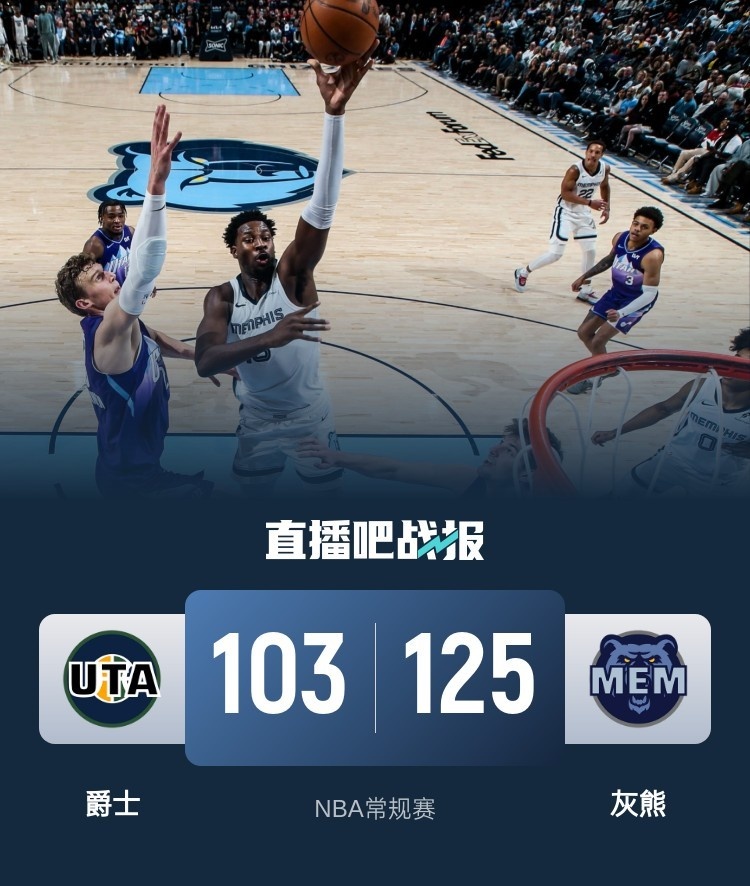 上半场,双方开场大打对攻,灰熊持续发力占据主动,莫兰特和乔治发生摩擦双双吃T,尤班克斯冲撞埃迪被直接驱逐,灰熊稳扎稳打扩大优势,半场战罢灰熊65-57领先爵士。下半场,爵士命中率下降,灰熊火力全开,单节净胜19分一举将分差拉开到20分以上,末节基本沦为垃圾时间,最终,灰熊125-103轻取爵士,迎来6连胜。