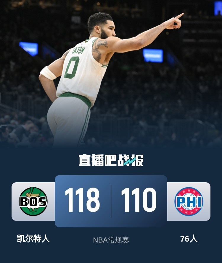 🏀塔图姆35+7+11 杰伦-布朗21+10 马克西34+6 绿军26分逆转76人
