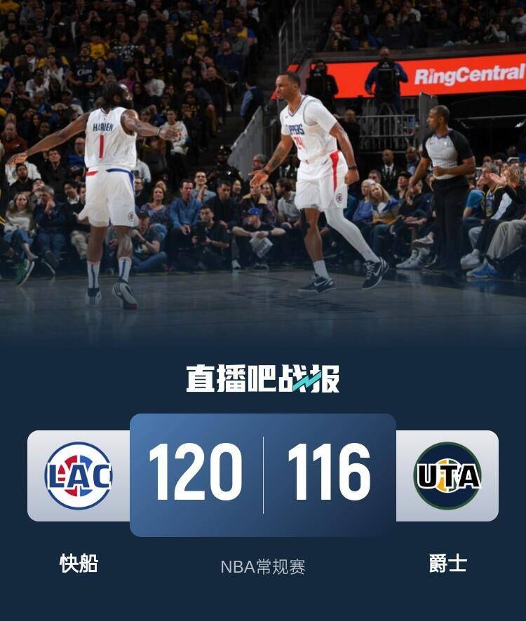 首节之争快船开局表现尚可但进入轮换阶段突然陷入被动,爵士短短4分钟里命中5记三分并送上17-8的攻势抢占主动权,期间本西接哈登秒传空接扣篮拿下快船生涯第一分;次节开局快船依旧被动,爵士则再送14-2的攻势直接拉开19分的优势。快船在前4分40秒里仅得2分的情况下及时回暖,哈登连续制造犯规拿下7分,鲍威尔协助抢分帮助球队追至6分进入下半场。休息归来快船进攻端只能依赖哈登和鲍威尔,而爵士也是抓住机会很快拉开两位数领先。不过末节快船总算不再慢热开局14-4的攻势直接扭转局势,这之后双方一路僵持,快船错失拉开比分的机会,爵士则依靠科利尔的罚球拖入加时。