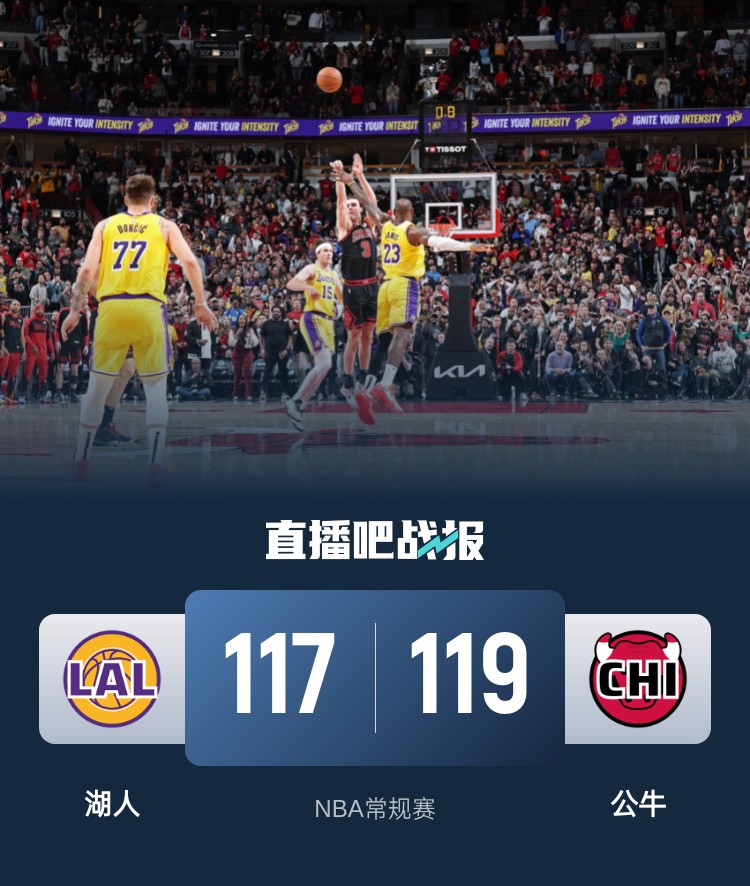 比赛开始,双方短暂相持,随后公牛持续发力,内外开花将分差拉开到两位数,湖人不断冲击内线努力追赶,次节湖人火力全开,里夫斯连投带罚拿分,詹姆斯得分助攻一肩挑带队不断蚕食分差,文森特准压哨三分反超,半场战罢湖人59-58领先公牛1分。易边再战,公牛命中率骤降,湖人大举进攻,多点开花一举将分差拉开到两位数以上,末节公牛突然发力打出11-0的攻击波迅速迫近比分,湖人内外开花稳住局势,公牛又是一波11-2延续希望,海斯补扣得手,许尔特三分追到只差1分,关键时刻里夫斯连投带罚拿到4分,但詹姆斯致命失误,公牛6秒内连得6分突然反超,里夫斯强攻再度夺回优势,基迪中场压哨三分神仙绝杀。最终,湖人117-119再负公牛,遭到双杀。