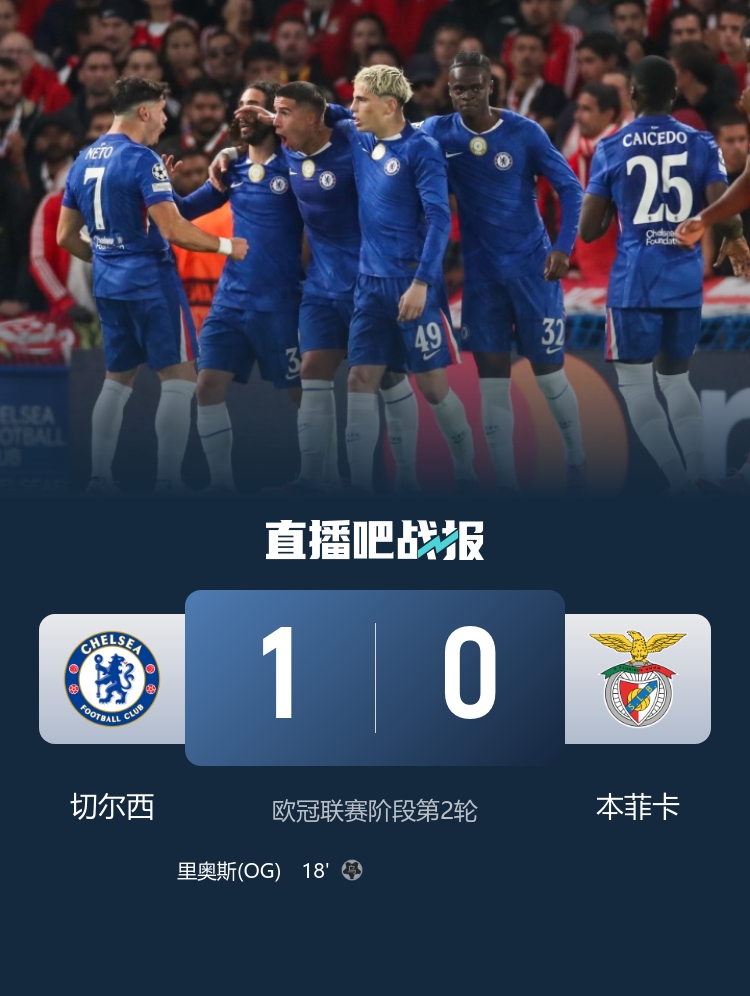 10月1日讯 北京时间3:00,欧冠联赛阶段第2轮,切尔西主场迎战本菲卡,穆里尼奥重回蓝桥!上半场,加纳乔造乌龙,里奥斯不慎打进自家大门!下半场,双方均无建树!最终,切尔西1-0击败本菲卡,取得新赛季欧冠首胜!