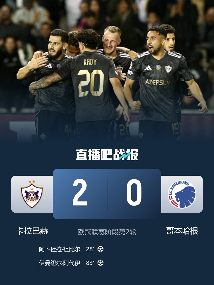 10月2日讯 北京时间10月2日00:45,欧冠联赛阶段第二轮卡拉巴赫迎战哥本哈根的比赛在巴赫拉莫夫体育场进行,上半场比卡略远射中柱,祖比尔补射破门首开记录,下半场拉尔森头球造险,阿代伊远射扩大比分,最终卡拉巴赫2-0哥本哈根取得欧冠两连胜。