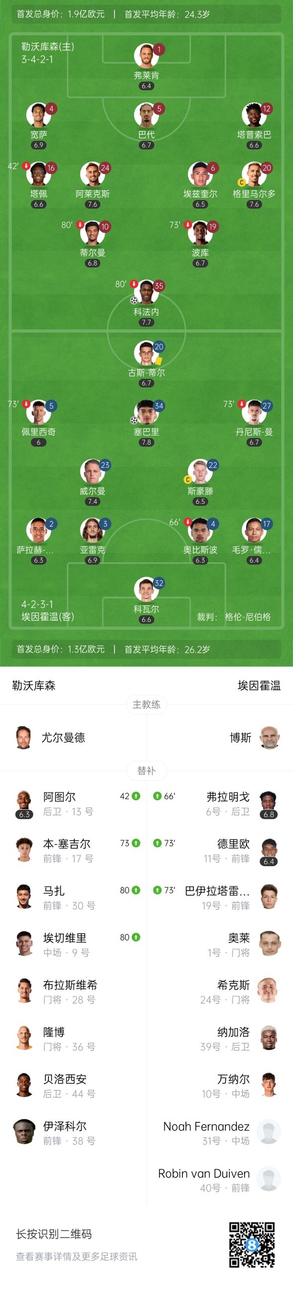 10月2日讯 北京时间10月2日03:00,欧冠联赛阶段第二轮勒沃库森迎战埃因霍温的比赛在拜耳竞技场进行,上半场格里马尔多爆射中柱,弗莱肯滑到险送礼,下半场波库抽射造险,科法内抢断后推射破门打破僵局,塞巴里抽射扳平比分,最终勒沃库森1-1埃因霍温遭两连平。