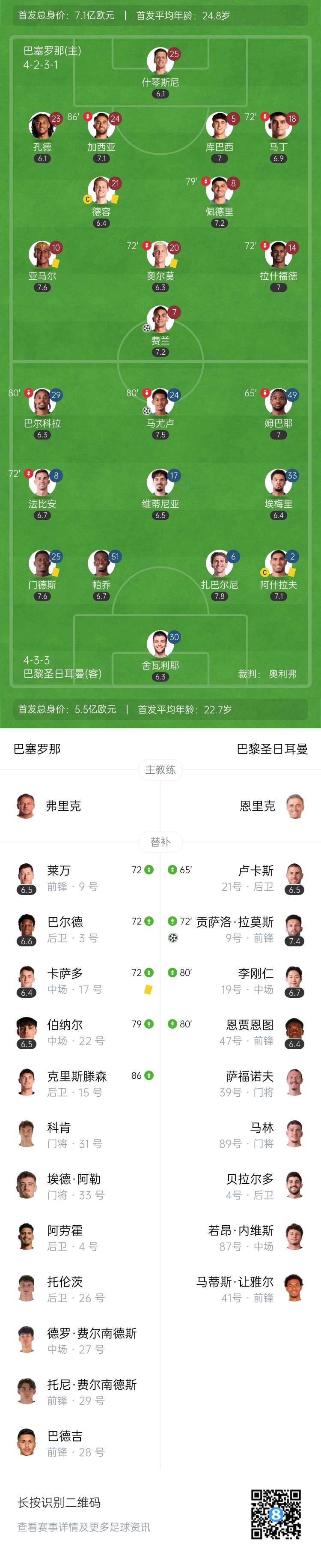 第19分钟,巴萨中场位置亚马尔抢断就地反击,弧顶佩德里分球左侧跟进的拉什福德,后者送出斜塞横敲门前,费兰跟进铲射包抄入网,巴萨1-0领先↓