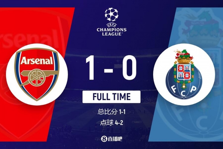最终点球大战结束,阿森纳点球大战4-2、总比分5-3胜波尔图晋级八强