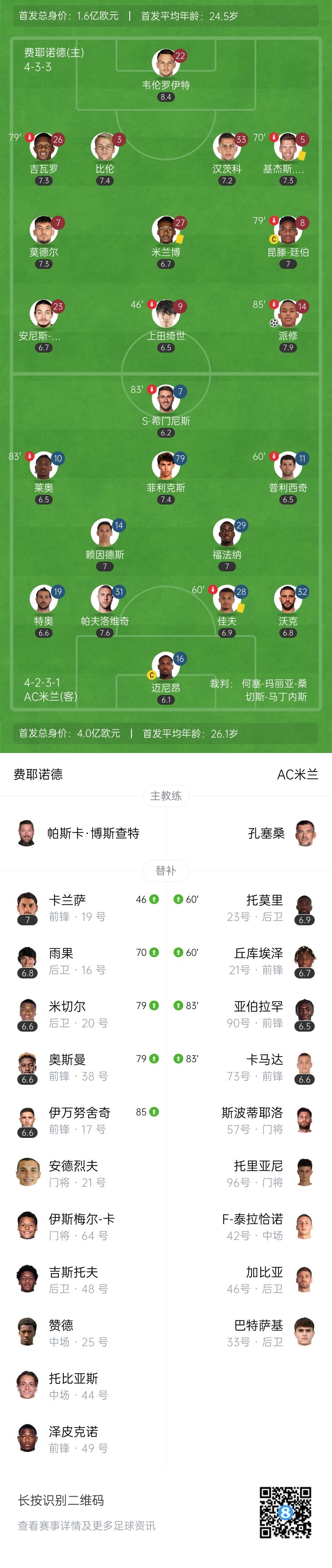 下半场补时6分钟。最终全场比赛结束,费耶诺德1-0米兰。