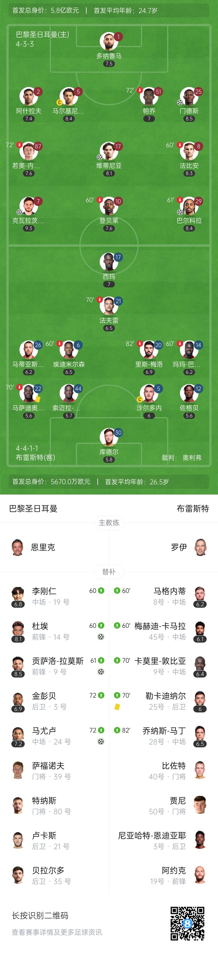 最终全场比赛结束,巴黎主场7-0两回合总比分10-0战胜布雷斯特晋级16强。