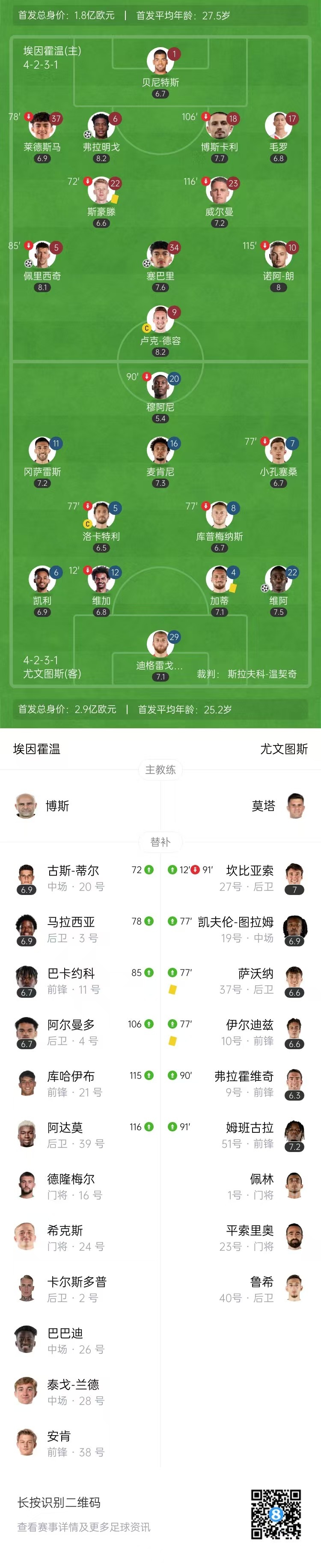 全场比赛结束,尤文图斯1-3埃因霍温。
