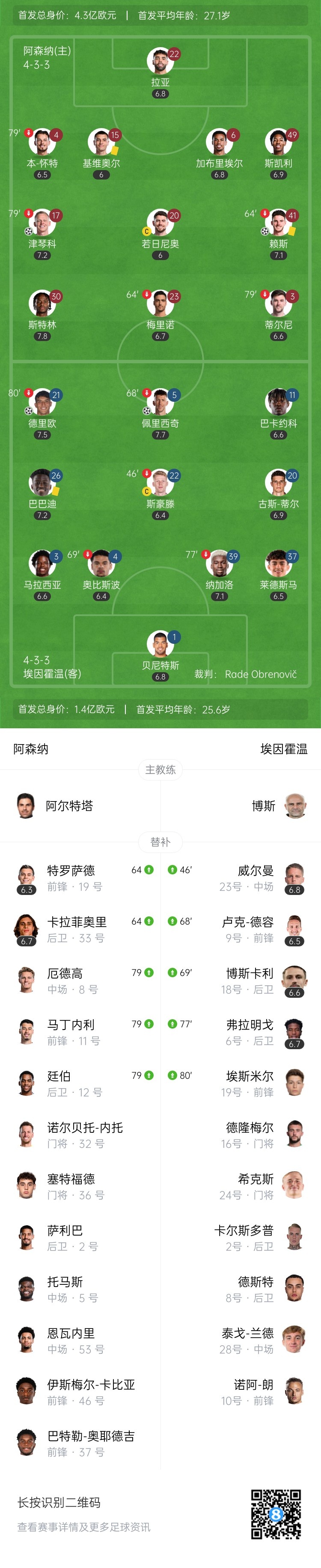 全场比赛结束,最终阿森纳2-2埃因霍温。