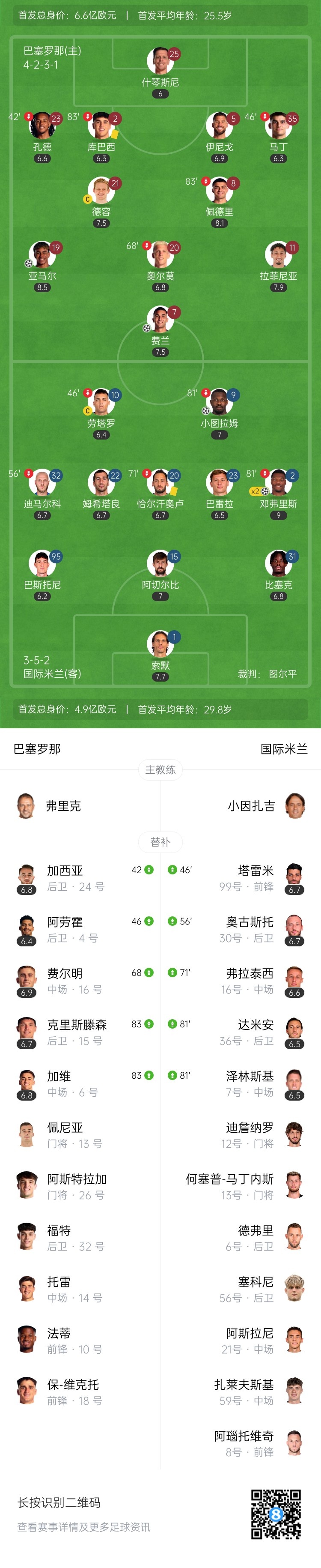 5月1日讯 北京时间3:00,欧冠半决赛首回合巴塞罗那vs国际米兰,比赛在奥林匹克体育场打响!上半场,邓弗里斯传中,小图拉姆开场30秒脚后跟闪击破门!随后角球中邓弗里斯侧钩破门!亚马尔个人能力1v5兜射破门!随后又击中横梁;费兰扳平比分!下半场,邓弗里斯头球破门完成双响!拉菲尼亚暴力远射反弹制造索默乌龙;姆希塔良破门因脚尖越位无效;亚马尔似传似射第二次中横梁!最终,巴萨主场3-3战平国米,双方次回合移师梅阿查!