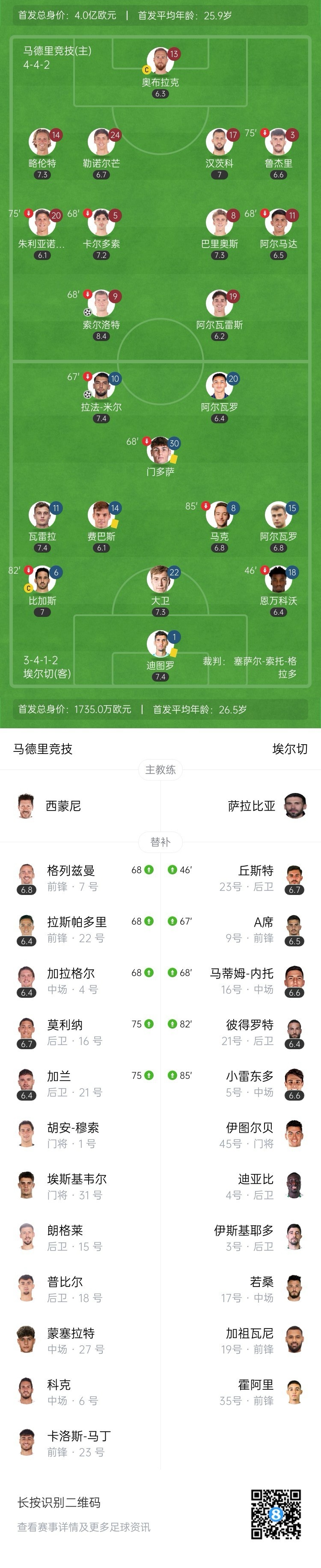第68分钟,马竞换人调整,格列兹曼、加拉格尔和拉斯帕多里替补登场。↓
