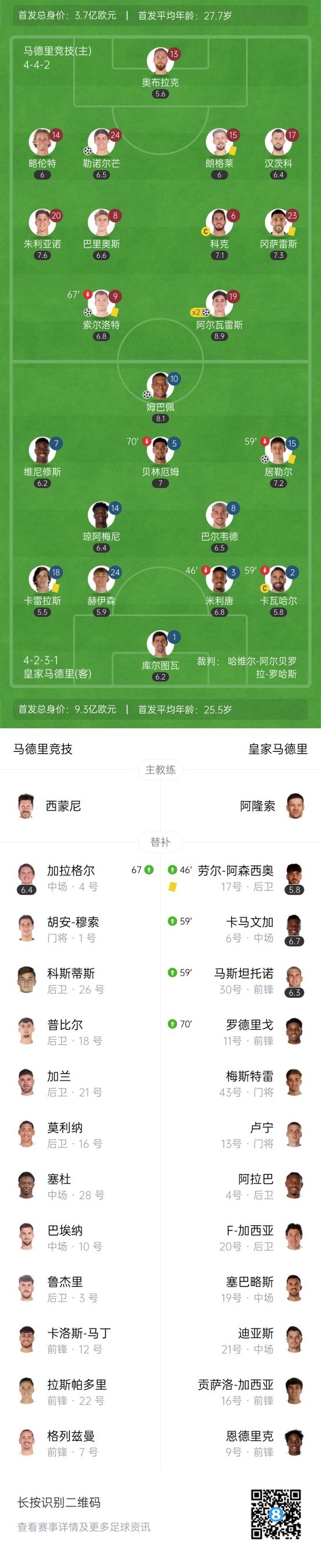 第63分钟,马竞扩大比分!左路弧顶定位球机会,阿尔瓦雷斯直接打门世界波球进,马竞4-2皇马。↓