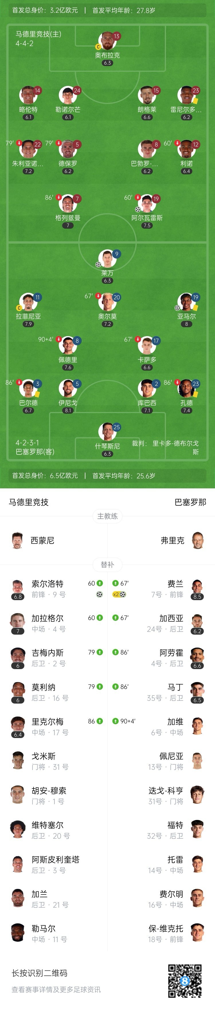 费兰替补建功!巴萨连追两球扳平!第78分钟,孔德回敲,拉菲尼亚45度角传中到禁区,无人盯防的费兰-托雷斯头球破门,马竞2-2巴萨!↓