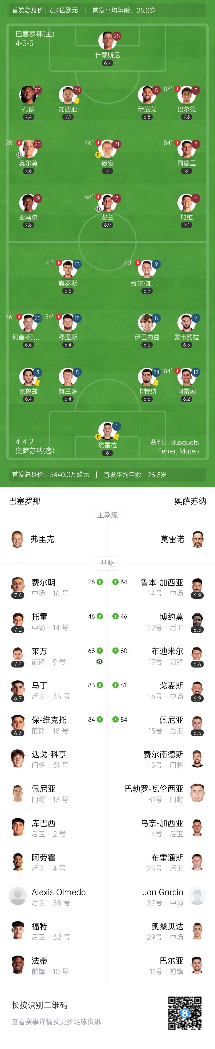 第11分钟,德容直塞分边,巴尔德不停球直接送横传,费兰-托雷斯包抄铲射破门!巴萨1-0领先奥萨苏纳↓