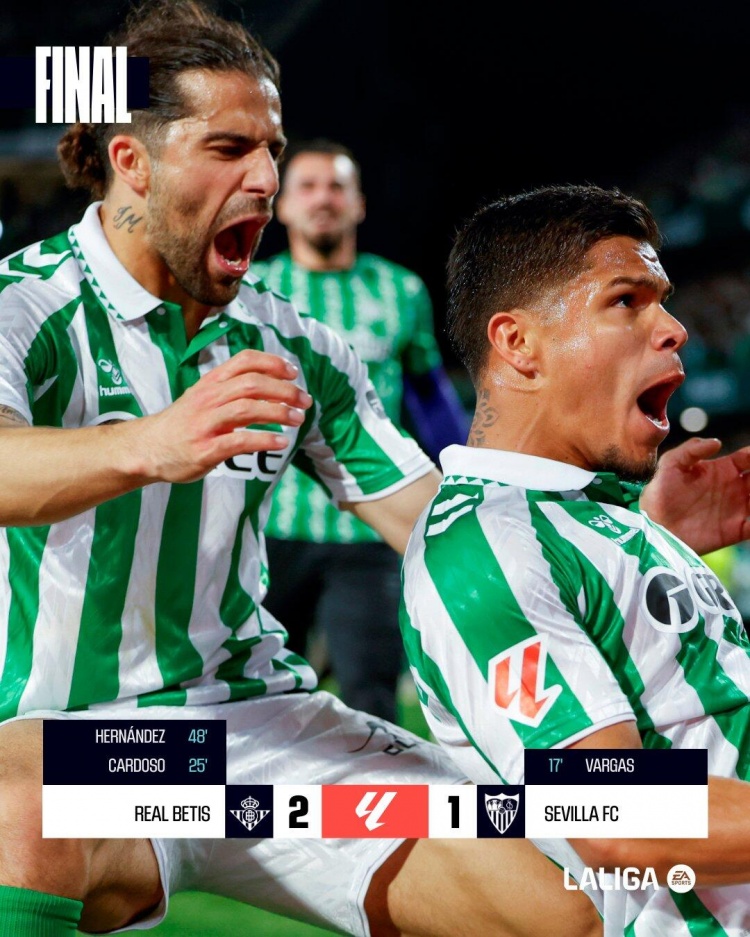3月31日讯 西甲第29轮,皇家贝蒂斯坐镇主场比亚马林球场迎战德比对手塞维利亚。上半场,巴尔加斯先拔头筹,卡尔多索、库乔破门反超比分。易边再战,安东尼凌空远射造险。最终贝蒂斯2-1塞维利亚。积分榜方面,贝蒂斯47分追平第五黄潜,塞维利亚36分第11。