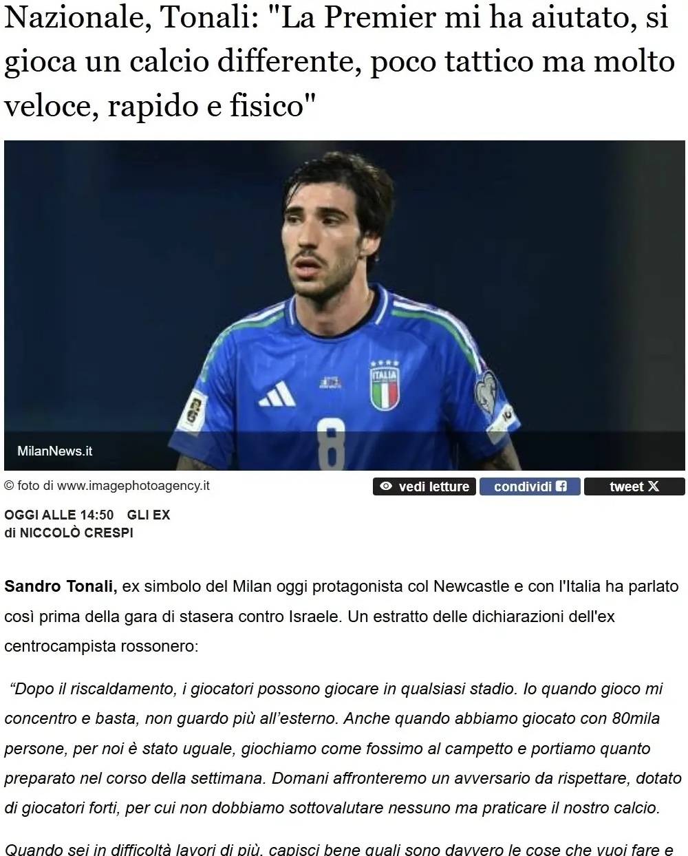托纳利说加盟英超对自身成长至关重要,在英超工作对我的成长十分重要,那里的足球风格与意大利完全不同。看着托宝的话有点难受,但内心清楚托宝说的是实话,今天的英超就是第一联赛,那里有世界最好的球员,只有与最好的球员对弈自身才能成长。