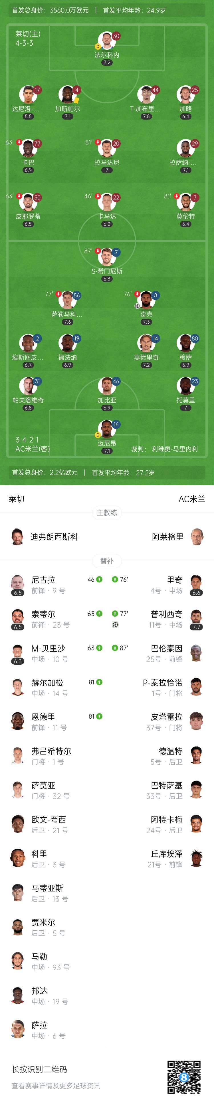 下半场补时5分钟。最终全场比赛结束,莱切0-2米兰。