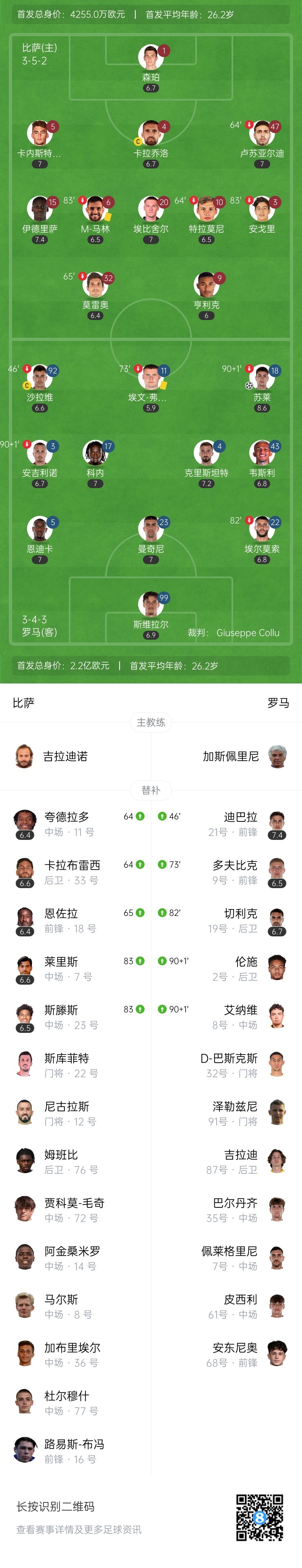 加公有能!罗马1-0客胜比萨意甲开局2连胜+连场零封 苏莱破门制胜
