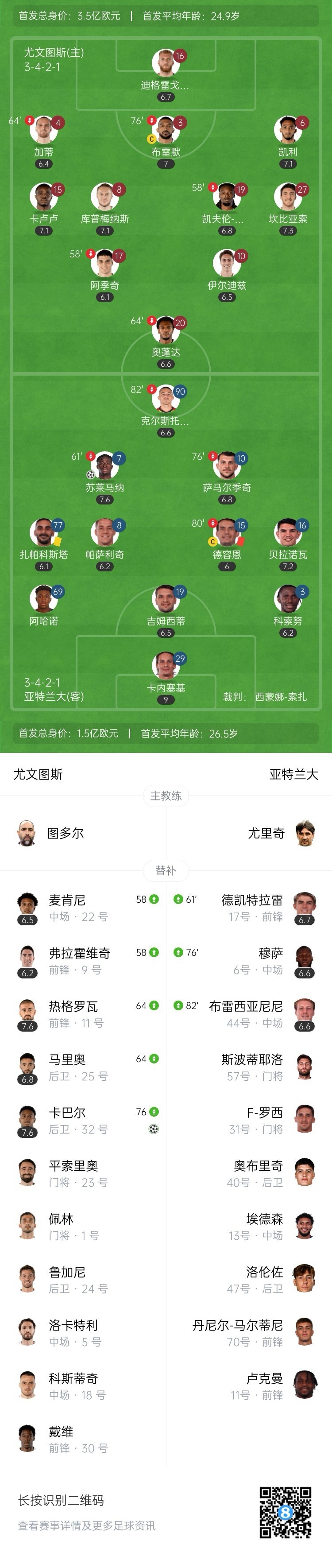 全场比赛结束,尤文图斯主场1-1战平十人亚特兰大。