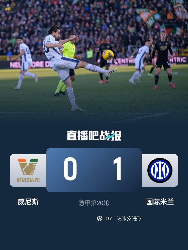 意甲-国米1-0威尼斯豪取联赛6连胜升至第二 达米安制胜球