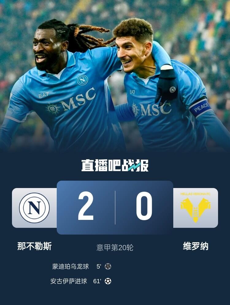 1月13日讯 意甲第20轮,那不勒斯主场迎战维罗纳,比赛在马拉多纳球场打响!上半场,迪洛伦佐远射制造门将乌龙。下半场,安古伊萨重炮远射破门!最终那不勒斯2-0击败维罗纳,报本赛季首轮0-3失利的一箭之仇!多赛2场领先国米4分,暂时领跑意甲。
