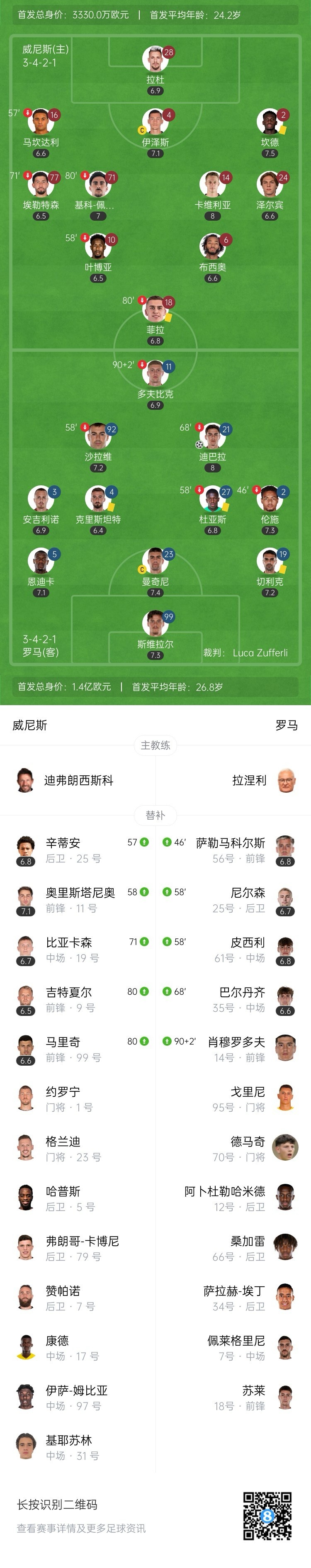 第30分钟,罗马任意球开至禁区,曼奇尼形成打门机会,威尼斯球员门线前完成解围。↓