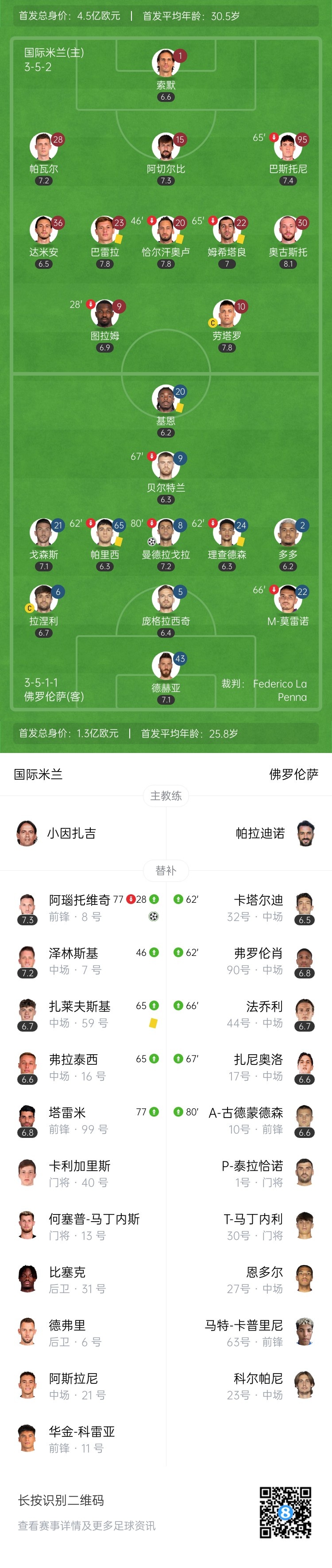 下半场补时4分钟。最终全场比赛结束,国米2-1佛罗伦萨。