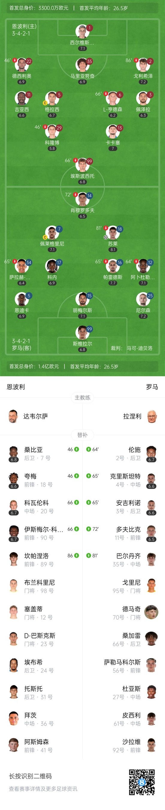 开场25秒,罗马闪击得手!埃丁左路下底横传右路弧顶苏莱转身抽射破门,恩波利0-1罗马。↓