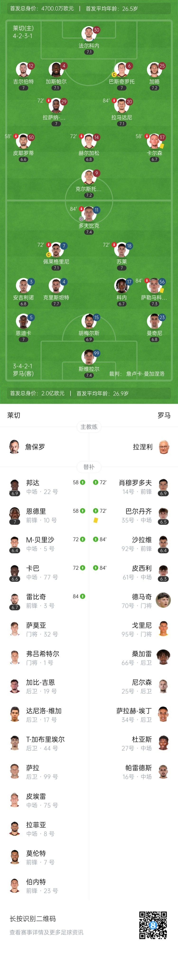 下半场补时6分钟。最终全场比赛结束,莱切0-1罗马。