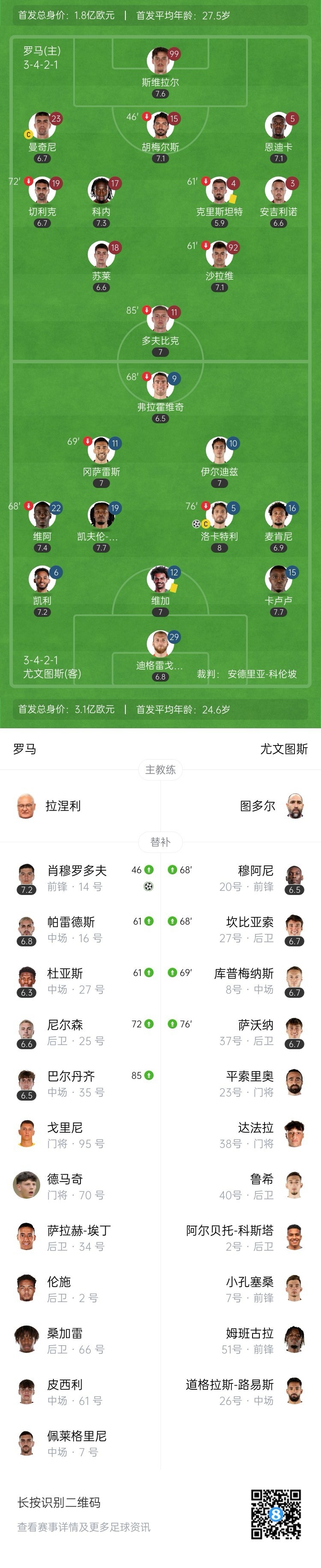 全场比赛结束,尤文1-1罗马。