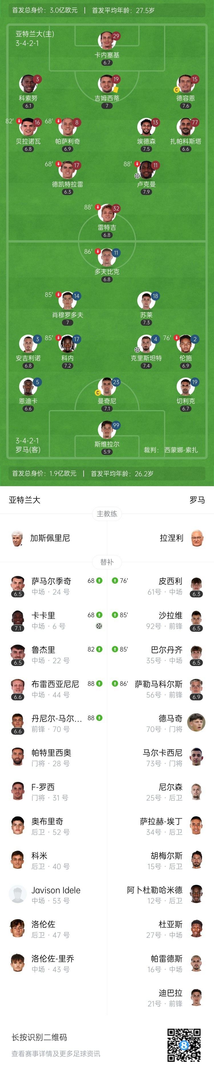 全场比赛结束,罗马1-2亚特兰大。