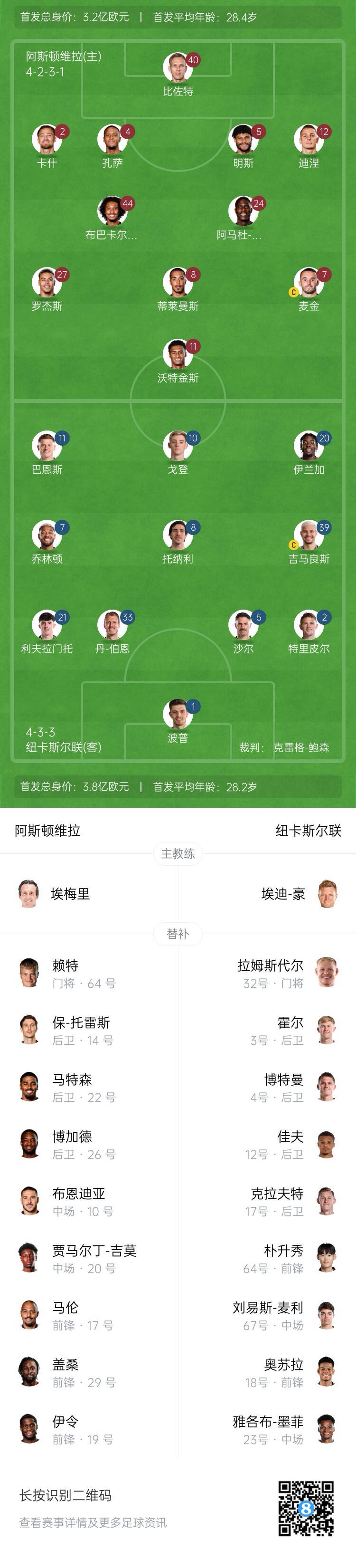 十人维拉0-0战平纽卡 伊兰加、戈登造险,孔萨直红,伊萨克缺阵