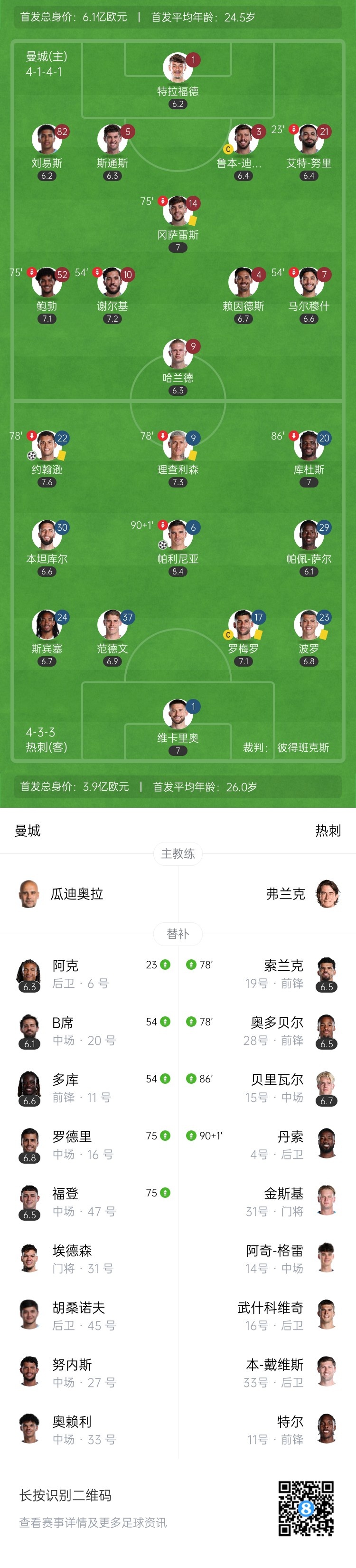 10月6日讯 北京时间23:30,英超第7轮曼城客场挑战布伦特福德,比赛在布伦特福德社区球场打响!上半场,哈兰德扛人抽射破门,罗德里无对抗情况下伤退。下半场,多纳鲁马扑出伊戈尔-蒂亚戈单刀!最终,曼城1-0击败...发表于:10月06日