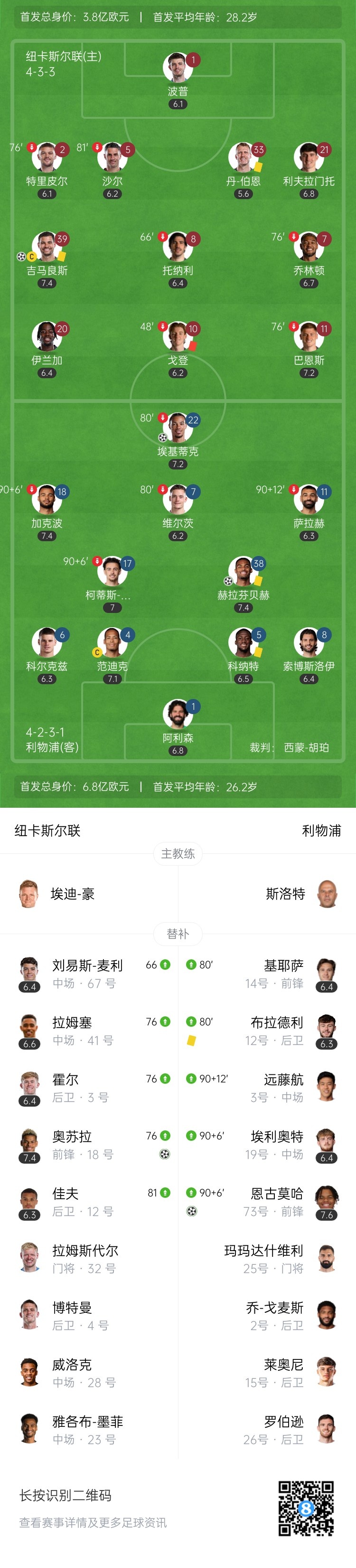 刺激!利物浦3-2十人纽卡 16岁恩古莫哈100分钟绝杀埃基蒂克破门