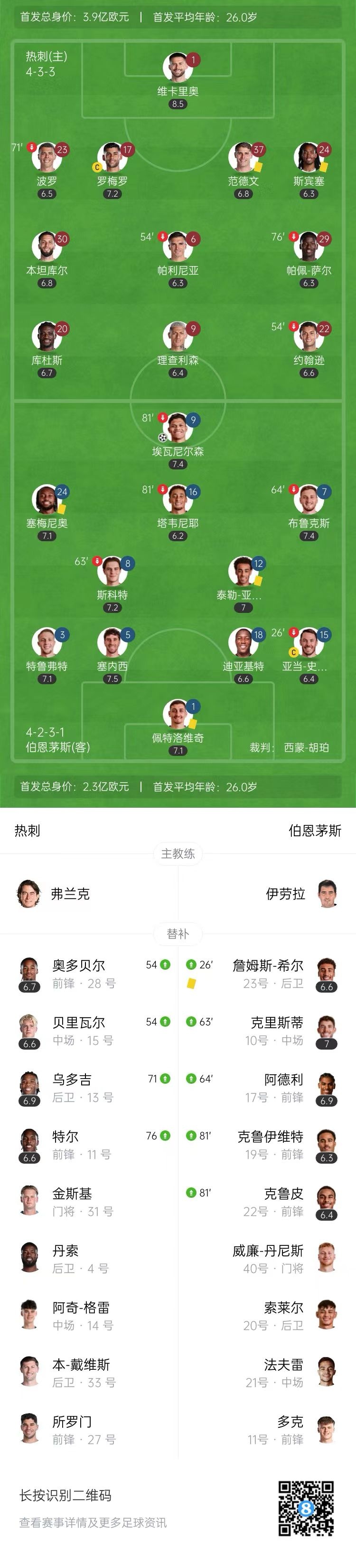 第69分钟,热刺前场传中,理查利森禁区做球,贝里瓦尔跟进横向内切打门,门将将球抱住。↓