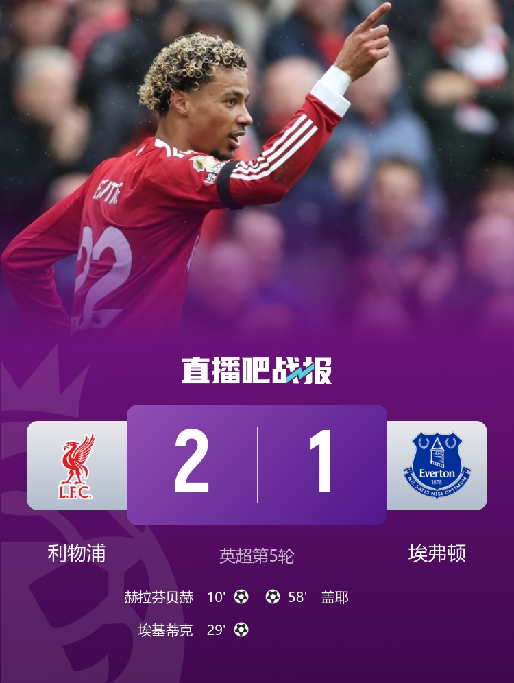 开局5连胜!利物浦2-1埃弗顿6分领跑 埃基蒂克破门赫拉芬贝赫传射