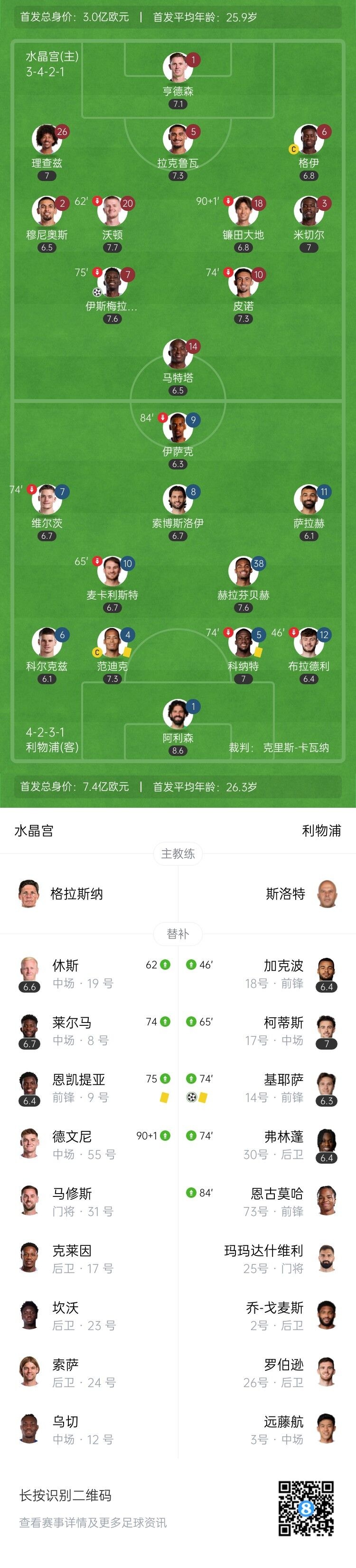 伤停补时6分钟。全场比赛结束,水晶宫2-1利物浦。