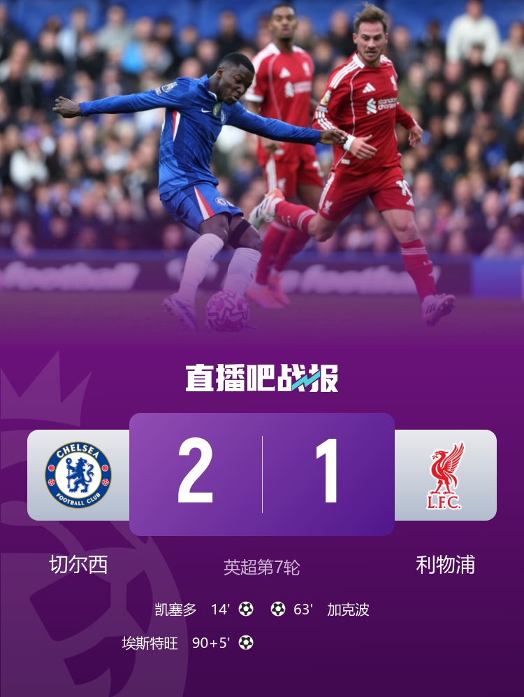 10月5日讯 北京时间10月5日凌晨0时30分,2025-26赛季英超第7轮在斯坦福桥球场展开角逐,切尔西主场迎战利物浦。上半场凯塞多世界波,加纳乔禁区倒地未判罚引争议,红军半场零射正,下半场加克波扳平,伊萨克精妙助攻,蓝军2中卫伤退,恩佐中柱,18岁埃斯特旺补时绝杀。最终切尔西主场2-1战胜利物浦,红军各赛事遭遇3连败+连续2轮被绝杀。